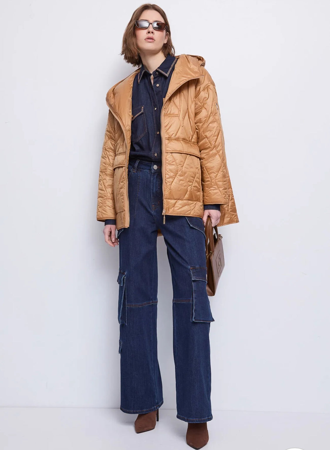 Comfort and modernity meet in these loose-fitting cargo jeans, perfect for pairing with a denim shirt and quilted nylon down jacket for an urban chic look. Complete the outfit with suede ankle boots and a mini logo handbag.